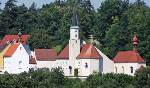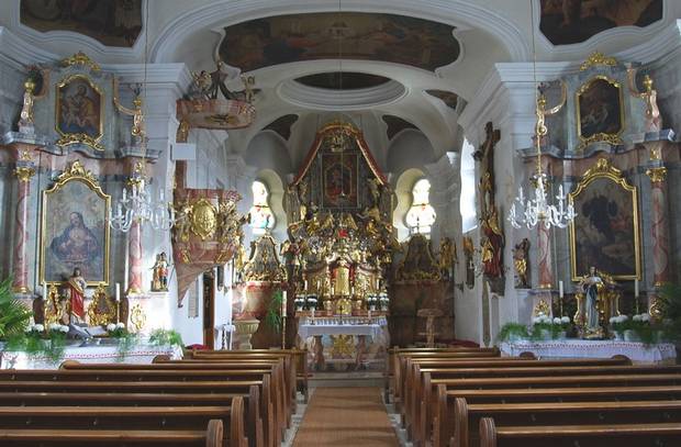 In der Mitte steht der mit überreicher Schnitzerei verzierte Hochaltar mit Baldachin. Die Engel tragen das bekannte Maria-Hilf-Bildnis nach Lukas Cranach dem Älteren. Über dem Tabernakel steht der heilige Erzengel Michael.